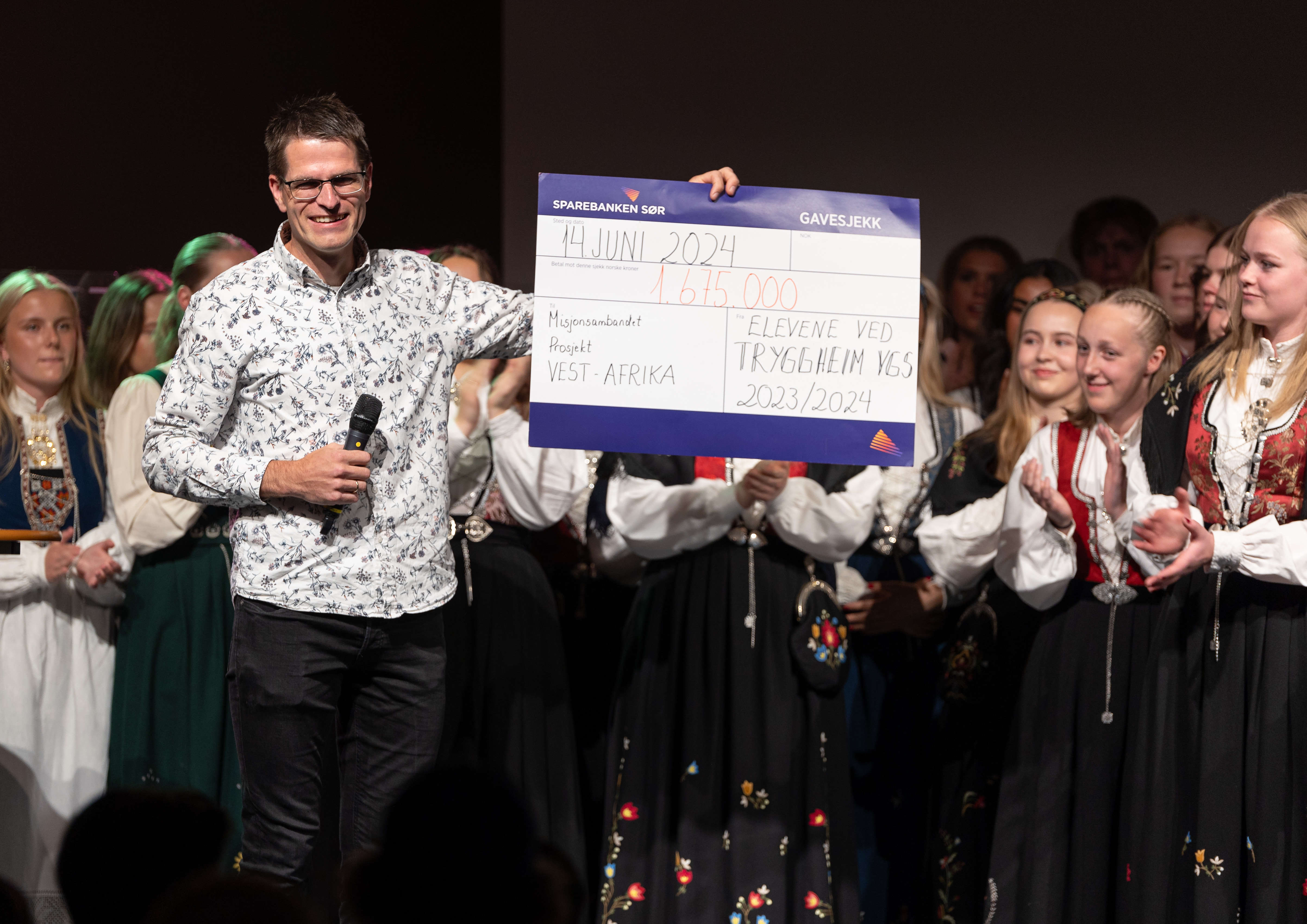 Aldri før har Tryggheim-elevane samla inn meir pengar enn gjennom årets aksjon. Ei fullsett storstove på skulen responderte med jubel og applaus då innsamlingssummen blei offentleggjord under avslutningsfesten for Vg3-klassane og avgangselevane på Vg2 yrkesfag fredag 14. juni. Prosjektleiar Ida i russestyret er takknemleg for engasjementet elevane har vist gjennom skuleåret.