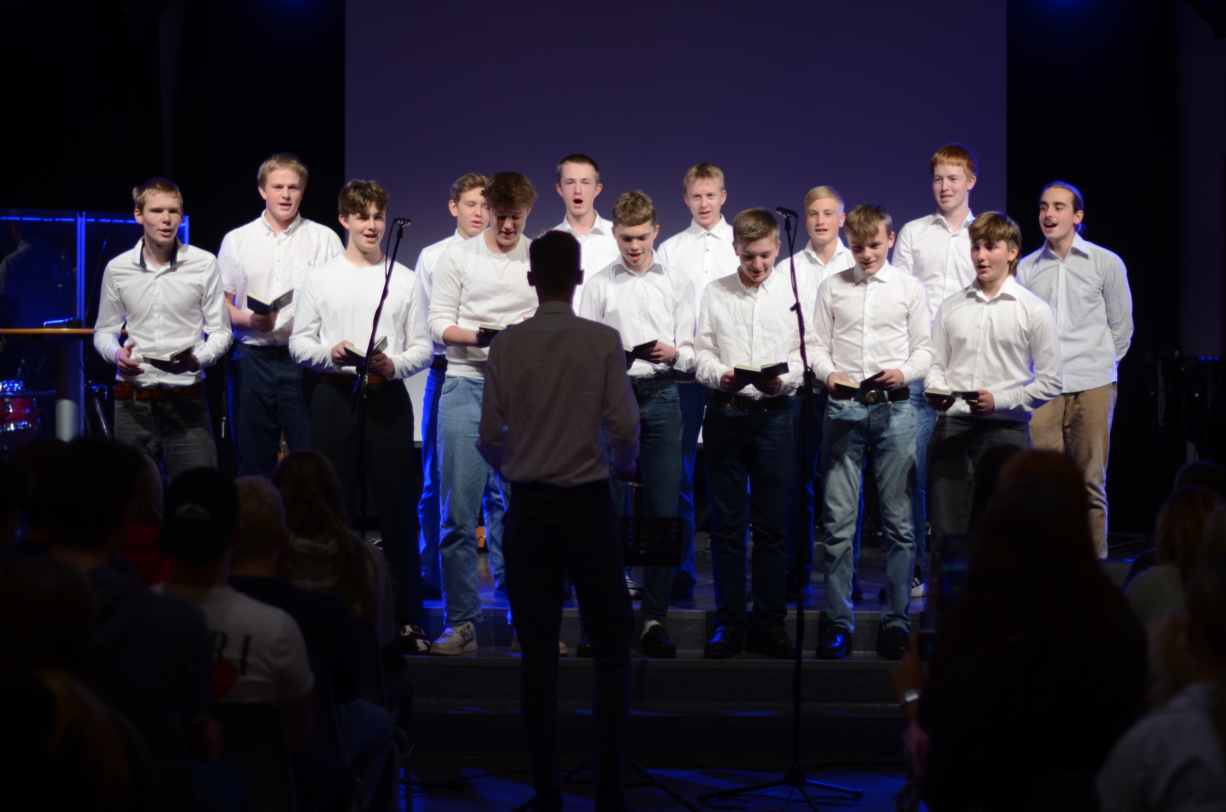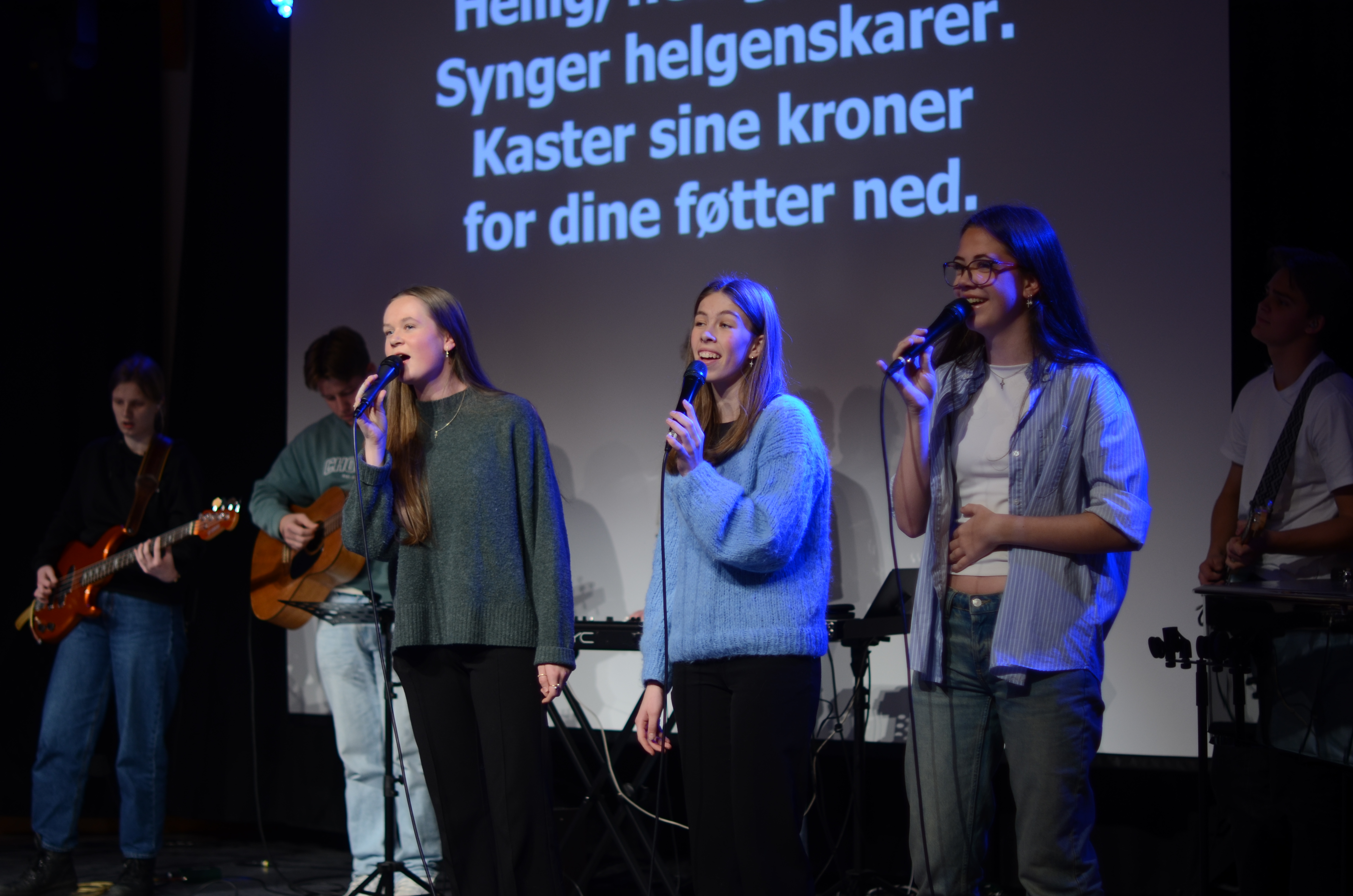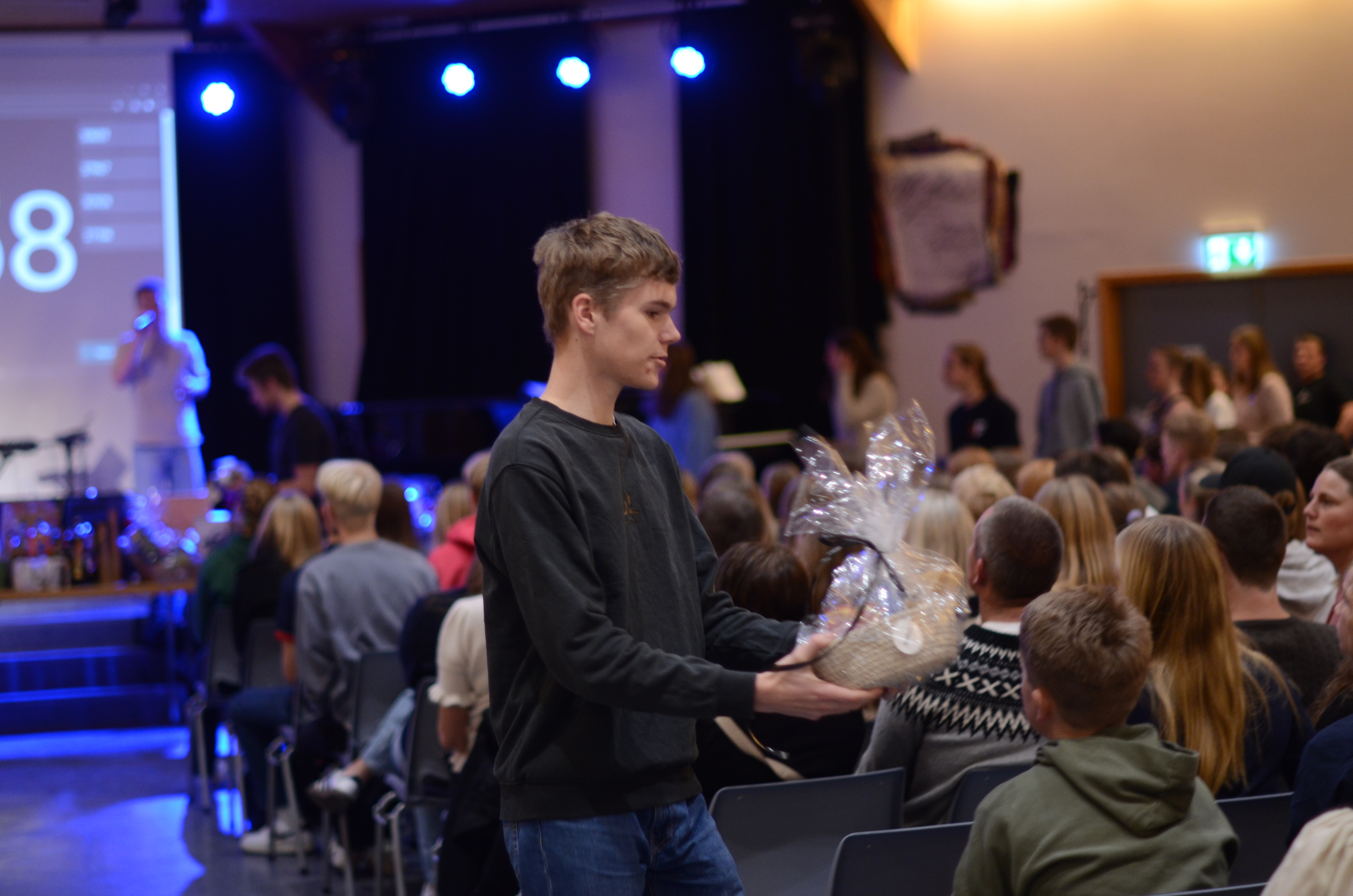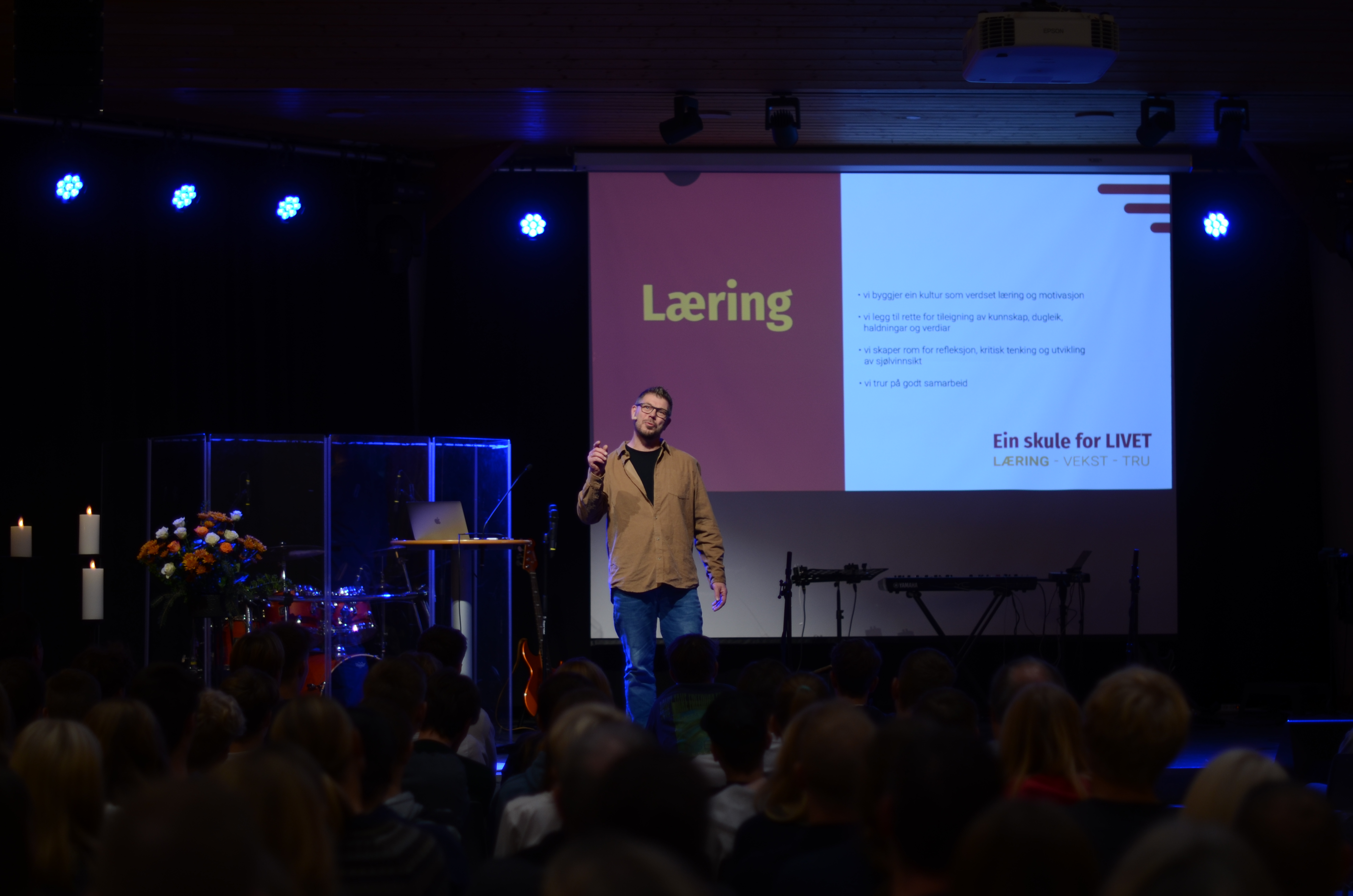 På programmet i møtesalen stod også songinnslag av elevar, foredrag av formidlaren Alexis Lundh i organisasjonen Tro & Medier og andakt av Nærbø-pastoren Magnus Nebdal.